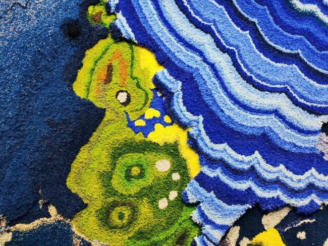 La presenza di oggetti, inclusi minerali e altri materiali organici, rimanda agli amuleti che in alcune tradizioni africane vengono regalati alla nascita di un bambino e alle erbe usate per le loro proprietà curative sin dall’antichità. Il tappeto, viceversa, si riannoda alla storica abilità delle tessiture fiamminghe europee.