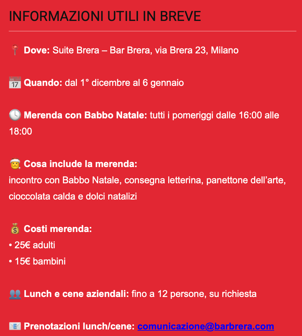 Dal 1° dicembre al 6 gennaio, la Suite Brera del celebre Bar Brera, in via Brera 23, si trasforma in un rifugio incantato dove famiglie, bambini e aziende possono vivere il Natale in modo autentico, scenografico e coinvolgente.